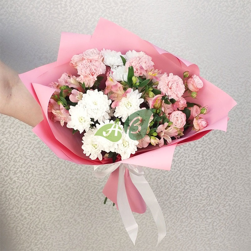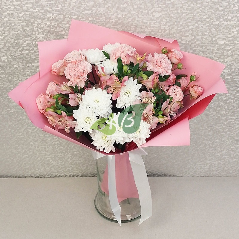 Букет из белых хризантем, розовых кустовых роз и розовой альстромерии – это сама нежность в вазе. Выпускной, 8 марта, свадьба, выписка из роддома – каждый праздник хорош для этих цветов с доставкой.